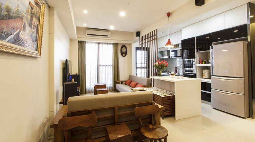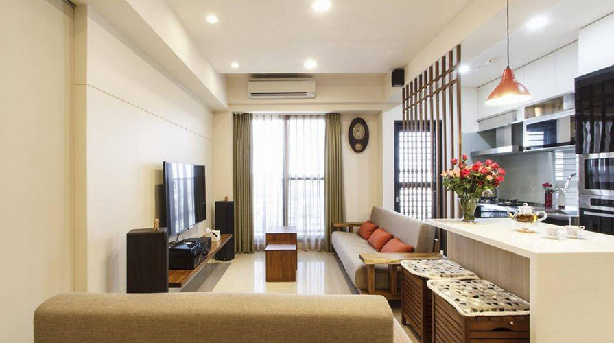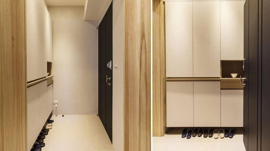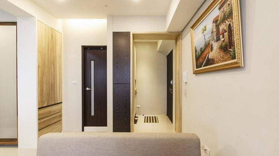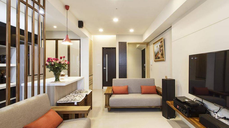 • 已屆退休年齡的夫婦,考慮到未來(lái)的兩人生活,搬入這家電梯大樓型式的生活空間。居室的功能規(guī)劃以實(shí)用為主,大量運(yùn)用屋主喜愛(ài)的木質(zhì)元素,利用不同的木質(zhì)顏色變化,巧妙將屋主事先選購(gòu)的天然柚木家具融入其中,銜接帶著自然觸覺(jué)的柚木紋理。設(shè)計(jì)師在考慮屋主的生活習(xí)慣后,保留客廳在前、廚房在后的相對(duì)位置,以木格柵為界,將餐廳機(jī)能簡(jiǎn)化于客廳與廚房之間,厚實(shí)的柚木家具,圍塑出明確的客廳空間。而原先餐廳的位置,成套的柚木對(duì)談椅置于柚木沙發(fā)后方,成為入門后的風(fēng)景。
