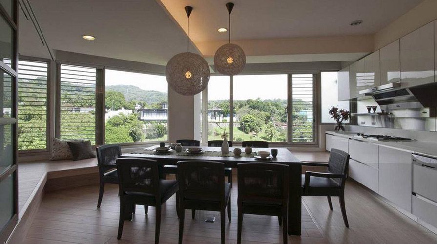 • 擁有絕佳美景的扇形屋,沿著屋廓有一整排的綠海對(duì)外窗,卻礙于原始包廂式的格局,將日光綠景拒于窗外。擅長(zhǎng)以動(dòng)線調(diào)整,擘畫家完美樣貌的將作設(shè)計(jì),重新布局空間格局的對(duì)等關(guān)系,引進(jìn)光與景,讓每一個(gè)空間都能感受來自大自然的恩典。 將作設(shè)計(jì)位移餐廚區(qū)至臨窗采光區(qū),以日式緣廊為概念,沿著屋廓架高平臺(tái),連接廚房、餐廳、和室與小孩房,打造綠光散步廊道,不僅擴(kuò)增餐廳的使用機(jī)能,可自由貫穿的動(dòng)線鋪排,完整了遠(yuǎn)眺的視野,連心胸也跟著開闊。